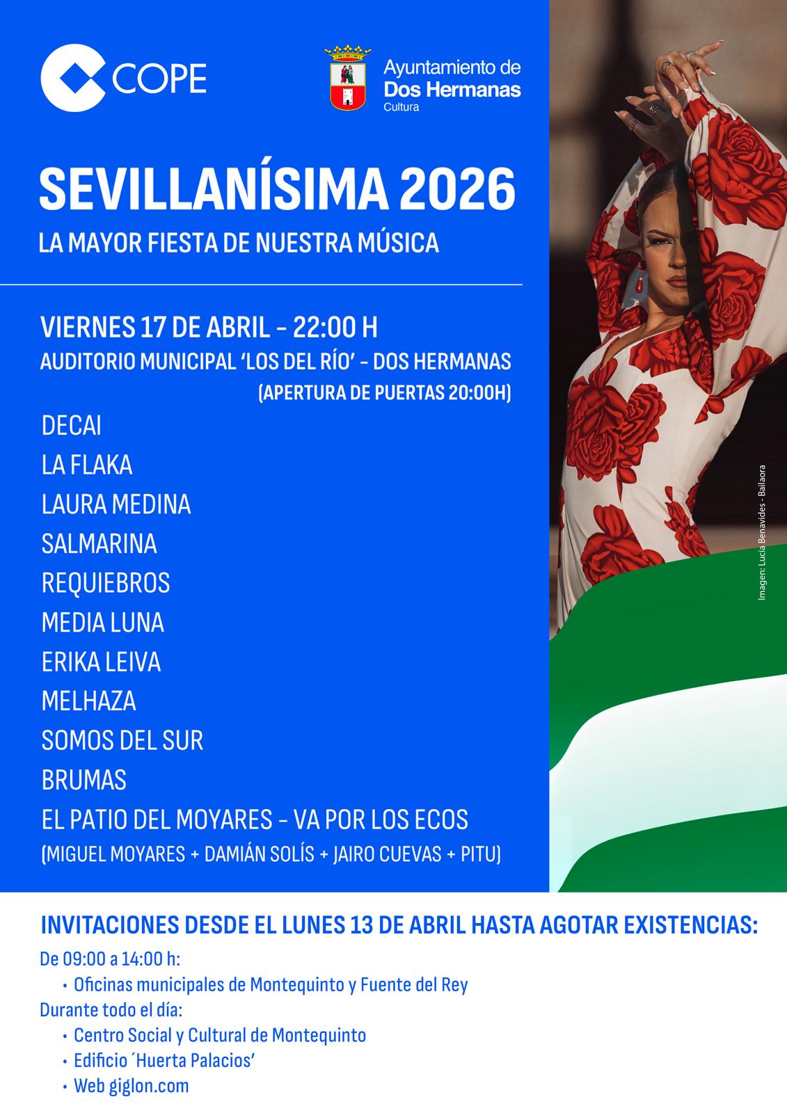 cultura@doshermanas.es SEVILLANÍSIMA 2026 LA MAYOR FIESTA DE NUESTRA MÚSICA- VIERNES 17 DE ABRIL 22:00H 955 67 92 08 GALA SEVILLANÍSIMA 2026 COPE - AYUNTAMIENTO DE DOS HERMANAS AUDITORIO MUNICIPAL...