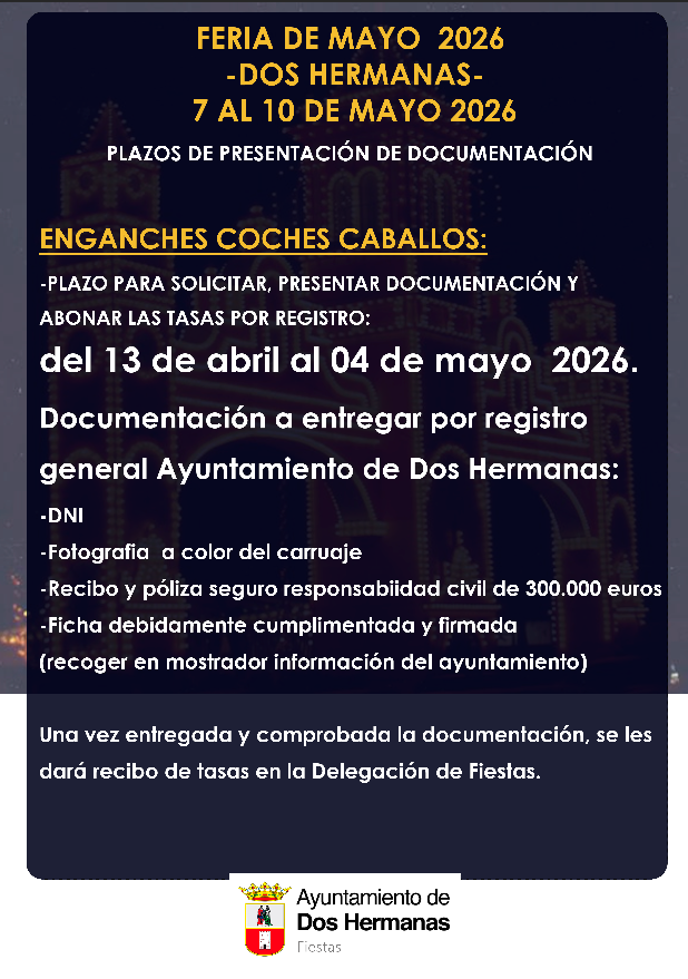 PLAZOS ENGANCHES COCHES DE CABALLOS Del 07 al 10 de mayo de 2026 FERIA DOS HERMANAS DEL 7 AL 10 DE MAYO DE 2026 Organiza: DELEGACIÓN DE FIESTAS Inicio: 7 de mayo de 2026 Finalización: 10 de mayo de 2026 Plazos Feria 2022