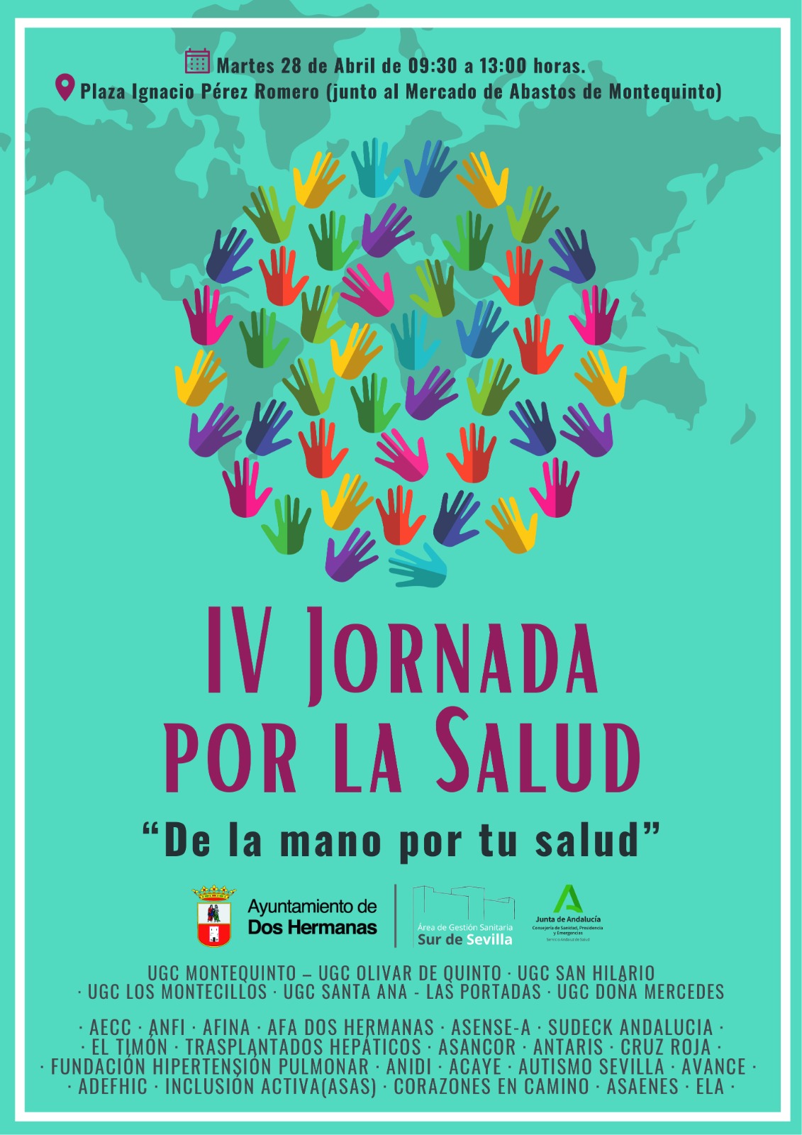 El próximo martes 28 de abril se va a celebrar en Montequinto la IV Jornada por la Salud, que organiza el Ayuntamiento de Dos Hermanas, en colaboración con los Centros de Salud (Montequinto, Olivar de Quinto, San Hilario, Los Montecillos, Santa Ana, Las Portadas y Doña Mercedes) y entidades de la localidad que trabajan por la salud, como son AECC, ANFI, AFINA, AFA DOS HERMANAS, ASENSE-A, SUDECK ANDALUCIA, EL TIMON, TRASPLANTADOS HEPÁTICOS, ASANCOR, ANTARIS, CRUZ ROJA, FUNDACIÓN HIPERTENSIÓN PULMONAR, ANIDI, ACAYE, AUTISMO SEVILLA, AVANCE, ADEFHIC, INCLUSIÓN ACTIVA (ASAS), CORAZONES EN CAMINO, ELA Y ASAENES. El horario de la actividad es de 9:30 a 13.00 horas.