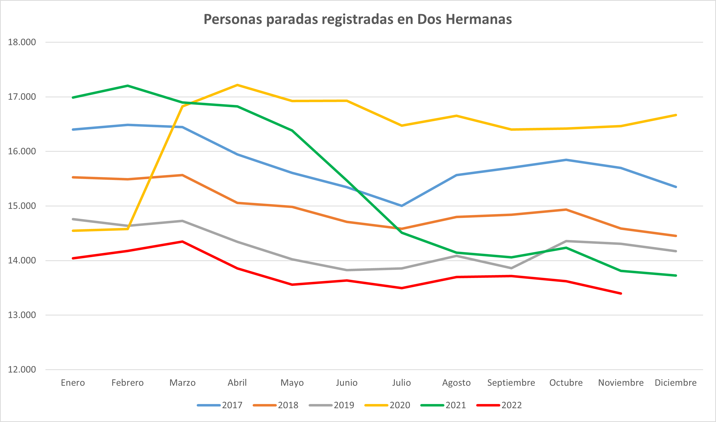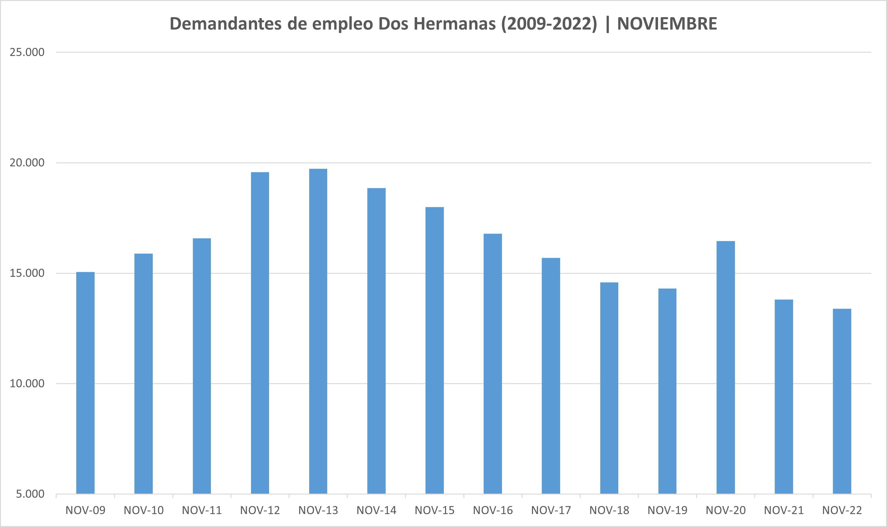 En cuanto al cómputo interanual (si contamos como referencia el mes de noviembre de 2021), en Dos Hermanas el número de personas paradas ha descendido en 412 personas, lo que supone un 3%; pasando de las 13.809 personas de noviembre de 2021 a las 13.397 personas de noviembre de 2022.