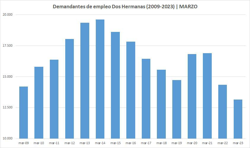 En cuanto al cómputo interanual (si contamos como referencia el mes de marzo de 2022), en Dos Hermanas el número de personas paradas ha descendido en 1.200 personas, lo que supone un 8,4%; pasando de las 14.346 personas de marzo de 2022 a las 13.146 personas de marzo de 2023.