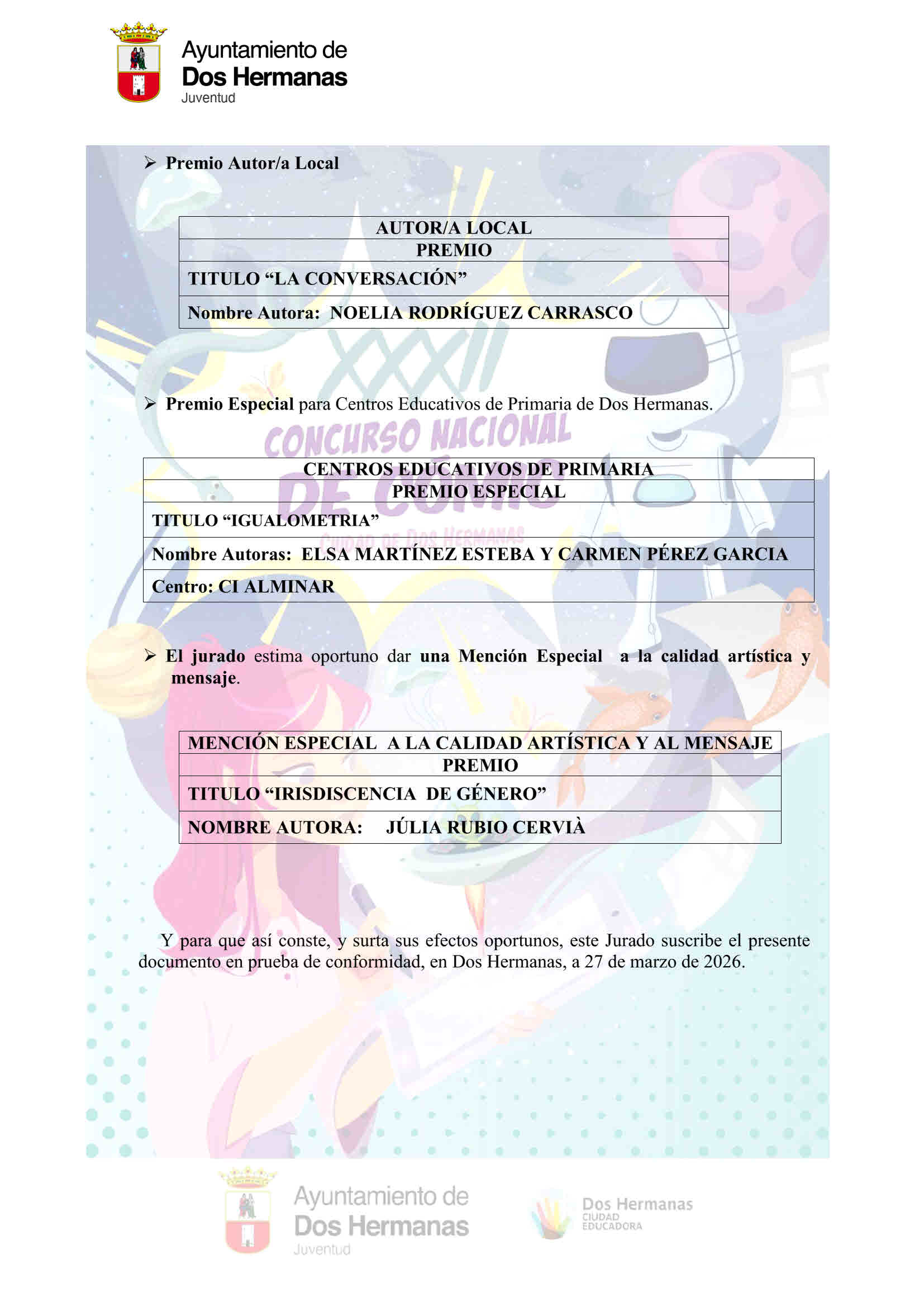 El Concurso Nacional de Cómic Ciudad de Dos Hermanas es una de las actividades de ocio cultural saludable, organizado por la Delegación de Juventud del Ayuntamiento de Dos Hermanas, que dirige María de los Reyes Garrido Jaén, poniéndose en marcha para fomentar la creación artística y cultural, e incentivando valores sociales, creativos y educativos. El concurso cuenta con una larga trayectoria que permanece en el tiempo gracias a la calidad artística, al incremento positivo de la participación y al compromiso que mantiene este Ayuntamiento con la cultura y con el arte, para apoyar al mundo del cómic y a sus grandes creadores y creadoras. Su consolidación y crecimiento hace que sea una de las citas más relevantes a nivel nacional dentro del mundo del cómic.