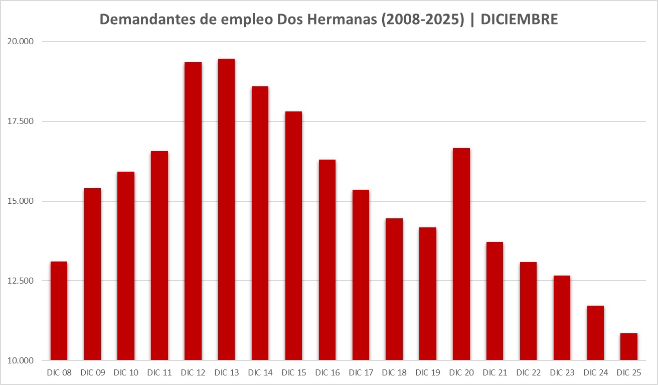 La evolución del mercado laboral en Dos Hermanas sitúa el desempleo en su nivel más bajo para un mes de diciembre. En el histórico del mes de diciembre, desde 2007 no se registra en este mes un menor número de personas paradas, anotando la menor cifra en un cierre de año desde el ejercicio de 2007.