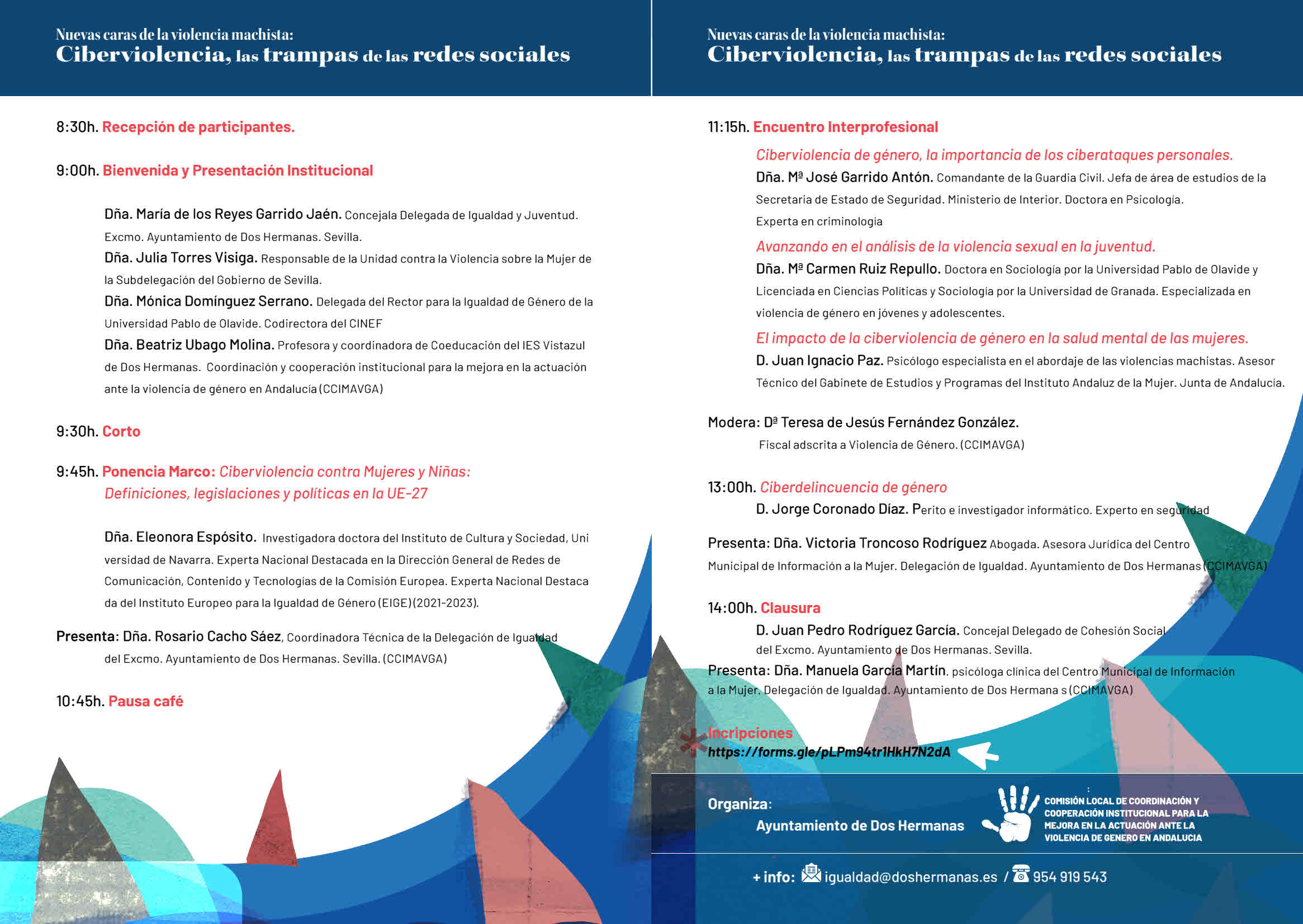 La Delegación de Igualdad del Ayuntamiento de Dos Hermanas, que dirige María de los Reyes Garrido Jaén, organiza la III JORNADA PROFESIONAL DE INTERVENCIÓN ANTE LA VIOLENCIA DE GÉNERO. “Nuevas caras de la violencia machista: Ciberviolencia, las trampas de las redes sociales”, con el objetivo de seguir avanzando en la coordinación institucional. El programa cuenta con grandes especialistas en la materia a nivel nacional e internacional.