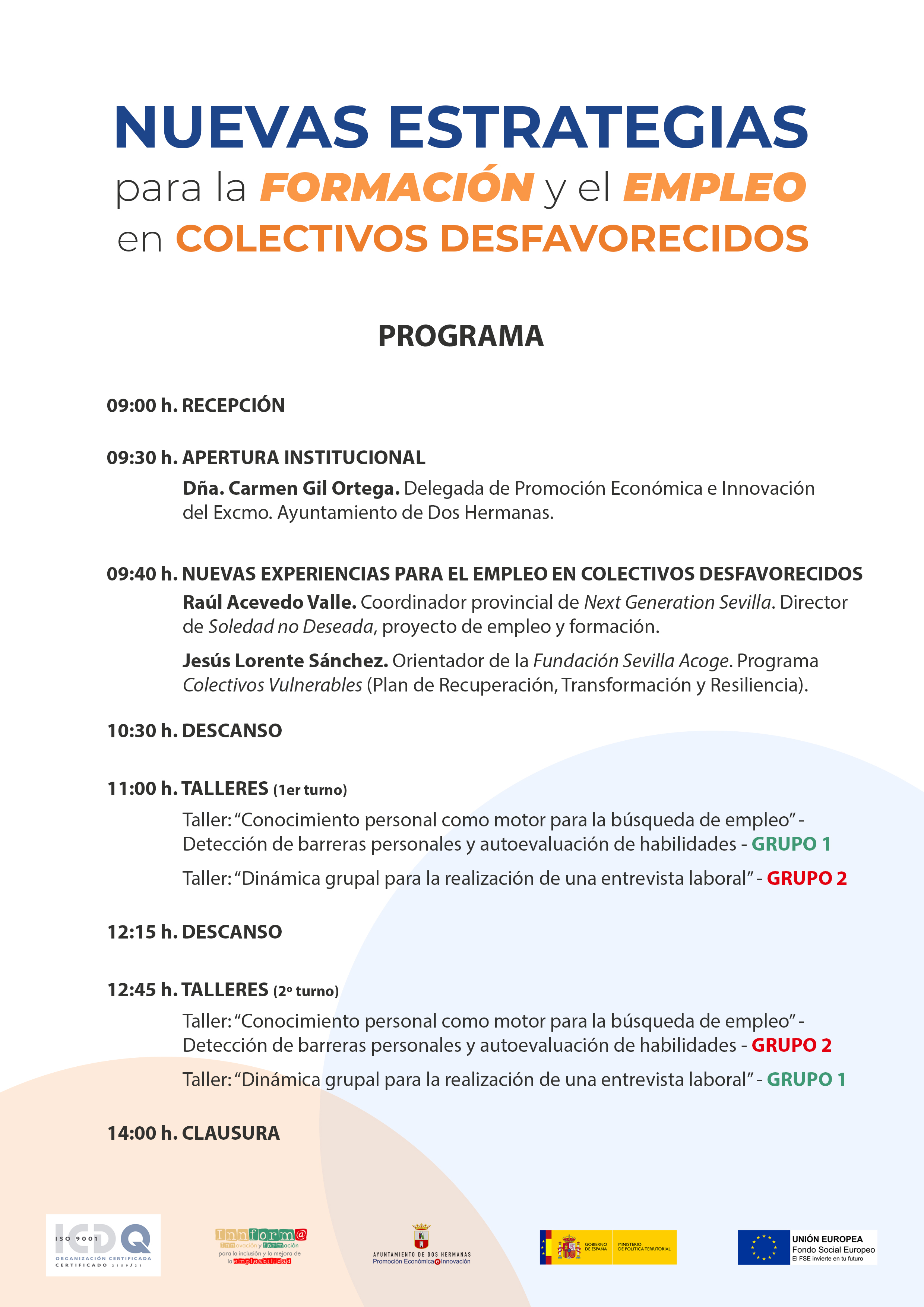 “Nuevas estrategias para la formación y el empleo en colectivos desfavorecidos” es el título de la jornada que tendrá lugar el próximo 26 de enero, en horario de mañana, en el edificio Parque de I+D ‘Dehesa de Valme’ de Dos Hermanas. Un acto que forma parte de las acciones innovadoras previstas en el Proyecto Innform@, programa de innovación y formación para la inclusión y la mejora de la empleabilidad, que organiza el Ayuntamiento de Dos Hermanas con la cofinanciación del Fondo Social Europeo.