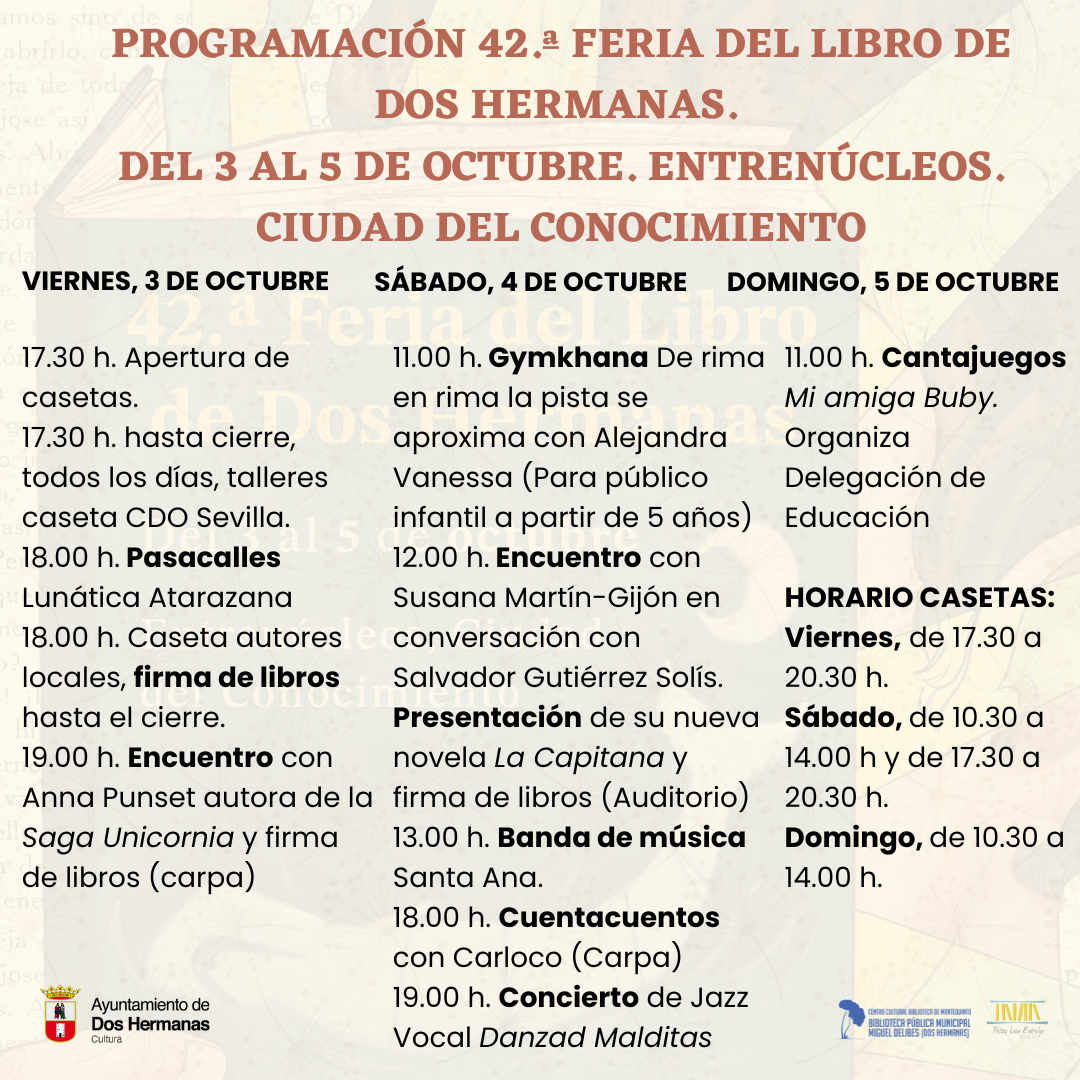 El Ayuntamiento de Dos Hermanas, a través de la Delegación de Cultura, que dirige la Teniente de Alcalde Delegada, Rosario Sánchez Jiménez, está ya ultimando los preparativos de la próxima 42ª Feria del Libro que, este año, se inaugura el próximo viernes, 5 de octubre, a partir de las 17:30 horas, en la Ciudad del Conocimiento de Entrenúcleos, Dos Hermanas.