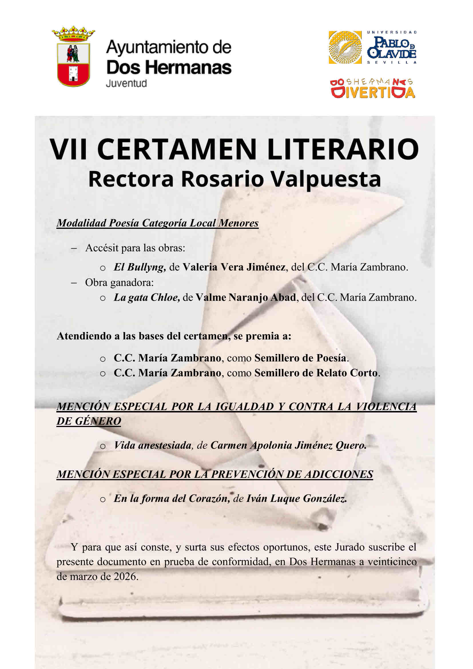 En Dos Hermanas, siendo las 18:30 horas del 25 de marzo de 2026 y una vez examinadas las obras presentadas al VII Certamen Literario Rectora Rosario Valpuesta, el jurado dictamina la siguiente relación de premios:
