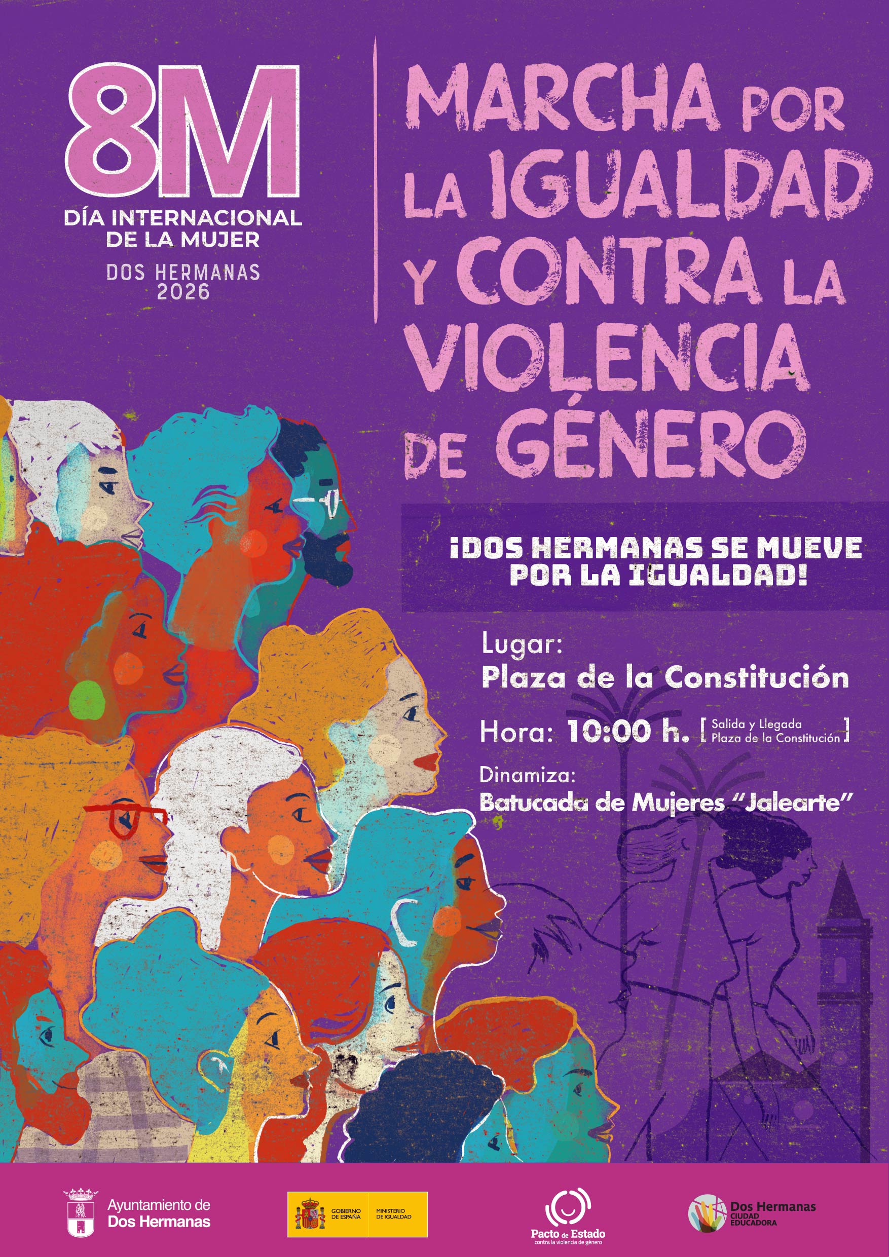 Al mismo tiempo y continuando con el formato de anteriores ediciones, se va a celebrar simultáneamente la Marcha por la Igualdad, que recorrerá las céntricas calles de Dos Hermanas. También con salida y llegada en Plaza de la Constitución, la marcha partirá justo después de la Carrera por la Igualdad, con una adaptación del recorrido (línea discontinua) para las personas que lo vayan a realizar andando hasta completar una distancia de 2 Km. aproximadamente. La marcha, abierta a la participación del público en general, estará dinamizada por la Batucada de mujeres "Jalearte".