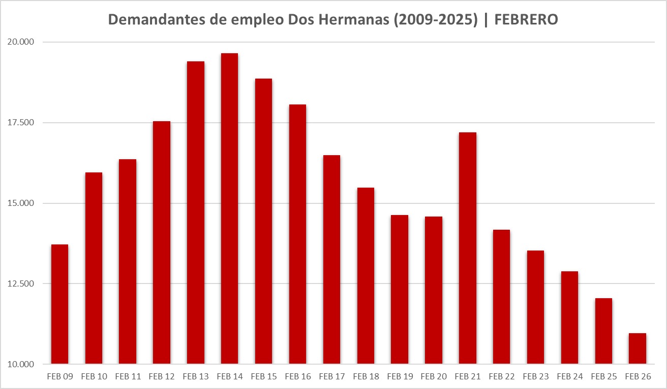 En cuanto al cómputo interanual (si contamos como referencia el mes de febrero de 2025), en Dos Hermanas el número de personas paradas ha descendido en 1.079 personas, lo que supone un 9%; pasando de las 12.044 personas de febrero de 2025 a las 10.965 personas de febrero de 2026. En el histórico del mes de febrero, desde 2008 no se registra en este mes un menor número de personas paradas.