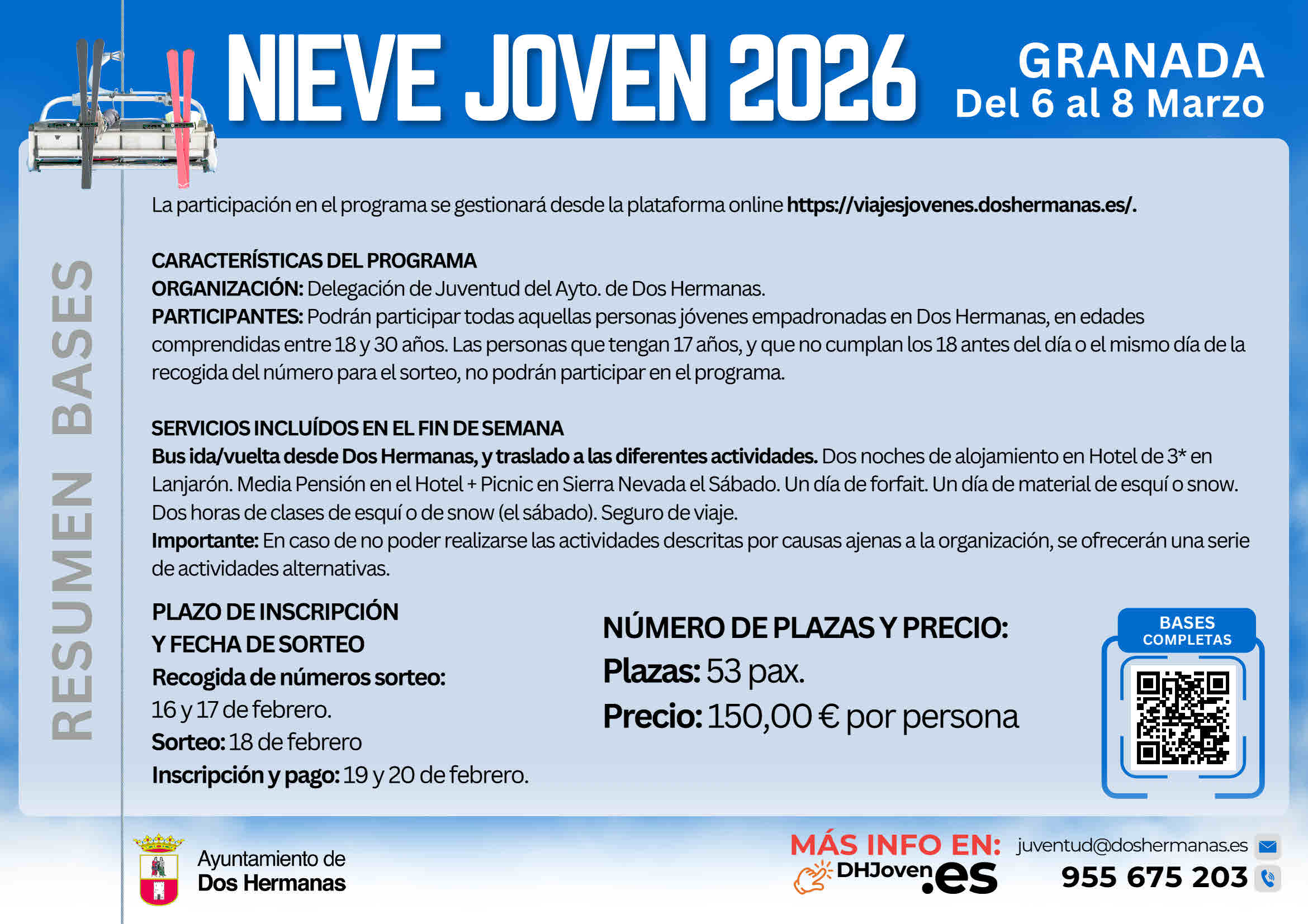 La Delegación de Juventud del Ayuntamiento de Dos Hermanas, que dirige María de los Reyes Garrido Jaén, sigue apostando por las actividades de ocio saludable para la juventud nazarena. El Programa Nieve Joven 2026 ofrece actividades, como la práctica de los deportes de esquí y snow a un precio asequible y se desarrolla en el paraje natural de Sierra Nevada. Dicho programa viene avalado por la fuerte demanda y respuesta que adquiere este tipo de actividades por parte de la juventud nazarena. La fecha elegida en esta edición es la del fin de semana del 6 al 8 de marzo.