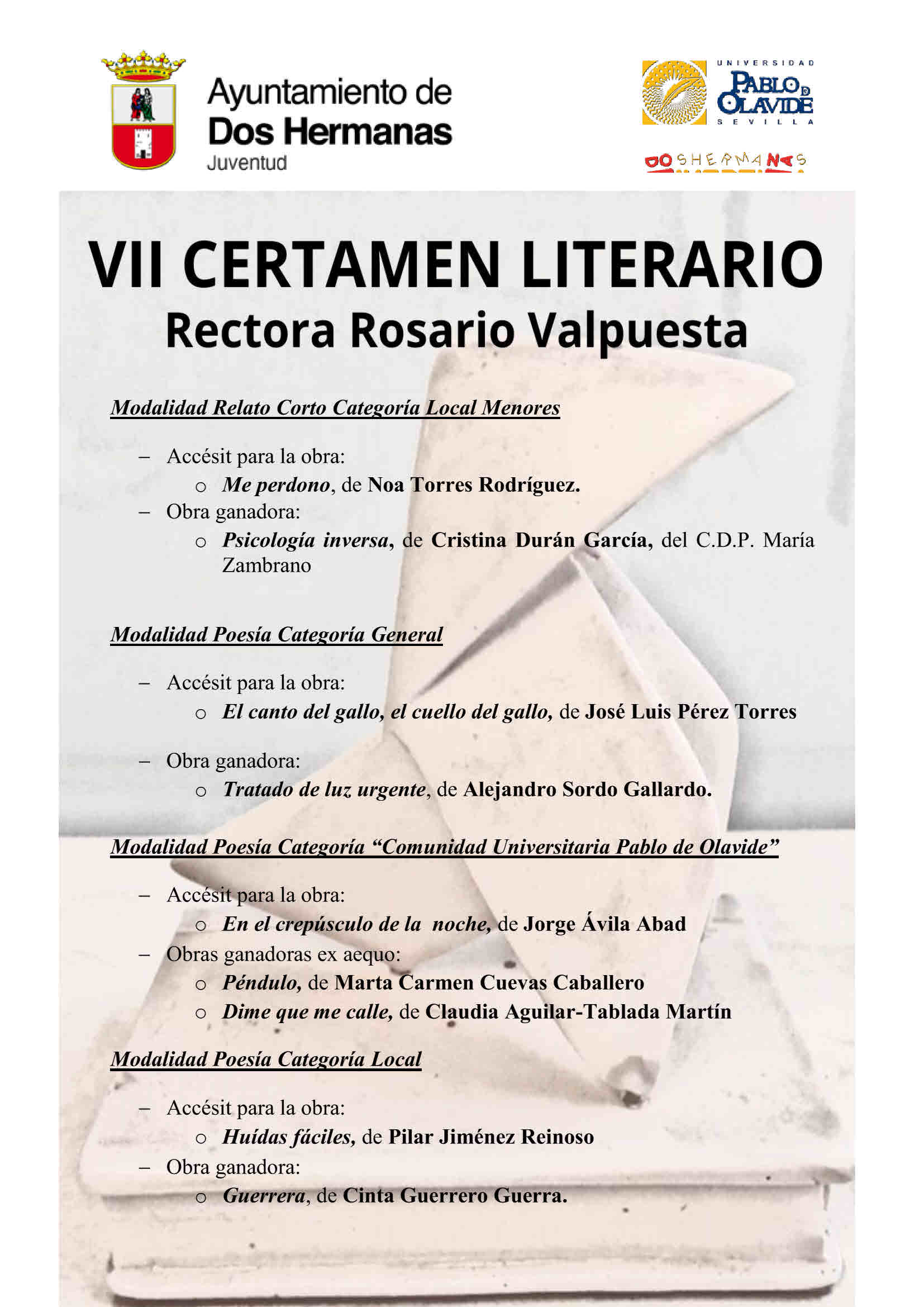 En Dos Hermanas, siendo las 18:30 horas del 25 de marzo de 2026 y una vez examinadas las obras presentadas al VII Certamen Literario Rectora Rosario Valpuesta, el jurado dictamina la siguiente relación de premios: